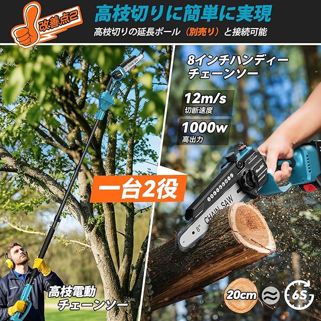 【高枝切りの延長ポールと接続可能な電動チェーンソー】2025 年最新改良版の電動チェーンソーが登場!当該製品は伸縮式延長ポールと簡単に接続でき、高枝切り作業をスムーズに行えるだけでなく、ハンディチェーンソーから高枝切り用の電動チェーンソーへ自由自在に切り替えられます。また、延長ポールを取り外すことで、手持ちのチェーンソーとしても使え、あらゆる作業シーンに柔軟に対応可能です。伸縮式延長ポールをお求めの方は、アマゾンにて商品コード「B0DPRTHGTW」を検索することで、簡単にご購入いただけます。