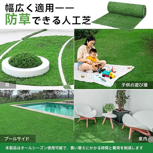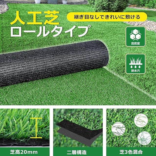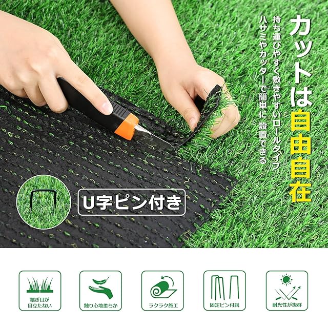 【ご注意下さい】※使用環境によっては熱による伸び縮みする場合があります。 ※生産時期により実際の商品と色味が異なる場合がございますので、並べて敷く際は一度ご購入下さい。 芝が横になっている場合は、手袋を着用し、芝生とは反対方向に芝生をこすってください。 使用中に何か問題が発生した場合は、Amazonの購入履歴に記載されている注文番号をメールでお気軽にお問い合わせください