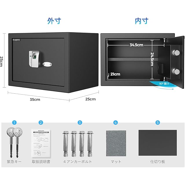 WASJOYE 指紋認証式 金庫 小型 電子金庫 家庭用 業務用 A4用紙対応 固定可能 鍵付き 防犯箱 セキュリティーボックス おしゃれなデザイン指紋認証セキュリティーボックス(22.0L)