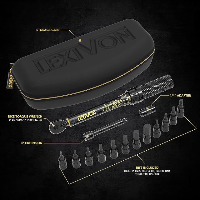 究極の自転車ツール - この15点セット自転車用トルクレンチは、2~26ニュートンメートル(17.7~230.1インチ・ポンド)の正確な目盛りと、0.2Nmまでの微調整が可能です。ビットソケット付き: HEX-H2、H2.5、H3、H4、H5、H6、H8、H10。TORX-T10、T20、T25、T30|3インチ・エクステンション・バー&1/4インチ・アダプター。