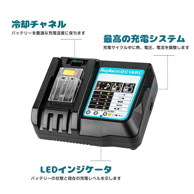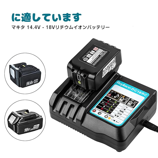 DC18RC充電器:充電完了メロディ:充電完了メロディーがありますので、音を聞いて充電完了のことがすぐわかります。LEDインジケータを使用した診断は、バッテリー充電状態を伝えます。安心安全:PSEおよびCE認定により、より安全に使用できます。マキタ純正DC18RC充電器と比べても遜色がない互換品となります。