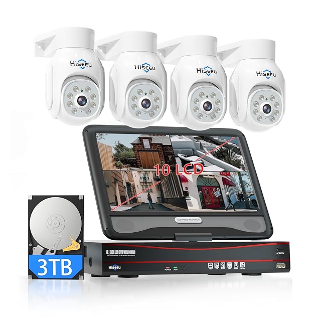 【500万画素・追尾機能搭載 ・POE有線接続】Hiseeu防犯カメラ poe給電 屋外 有線 監視カメラ 4台セット 10インチモニター PTZカメラ IP66防水 センサー発光 双方向音声 屋内外対応 暗視撮影 動体検知 常時録画 防犯カメラ セット スマホ/パソコン遠隔監視 アプリ通知 監視カメラ・録画機セット (カメラ4台+モニター付きNVR本体+3TB HDD)