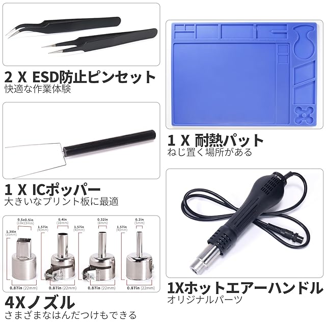 「パッケージ内容」959D熱風リワークステーション*1、プロの作業マット*1、IC抜取具*1、ノズル*3、ESD 防止ピンセット*2、2ピン電源プラグ*1(注意:電源は100V~110Vでお使いでき、事故防止のために、 200V~240Vの電源で使わないでください。)