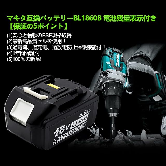 幅広く使われる: マキタバッテリー18v BL1860B 対応の機種:BL1860B、BL1850、BL1840、BL1830、BL1830B、BL1820B、BL1815、BL1815N など。このBL1860互換バッテリーはたっぶり6.0Ah 超高容量入っており、頻繁に充電する必要ないです。