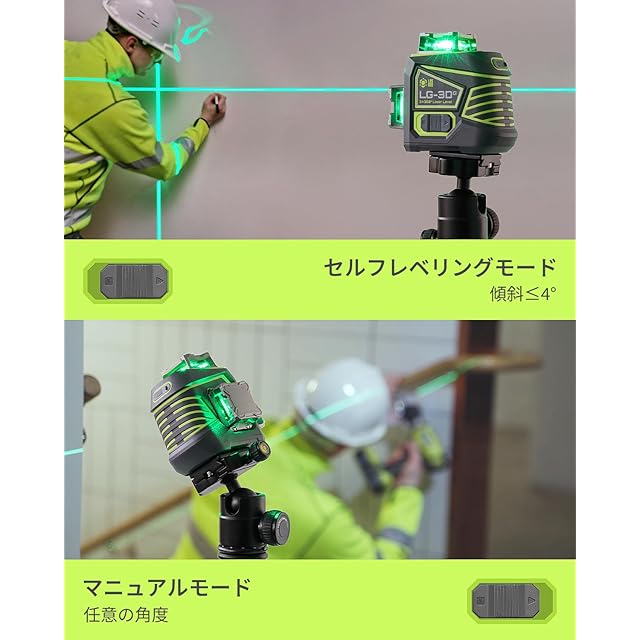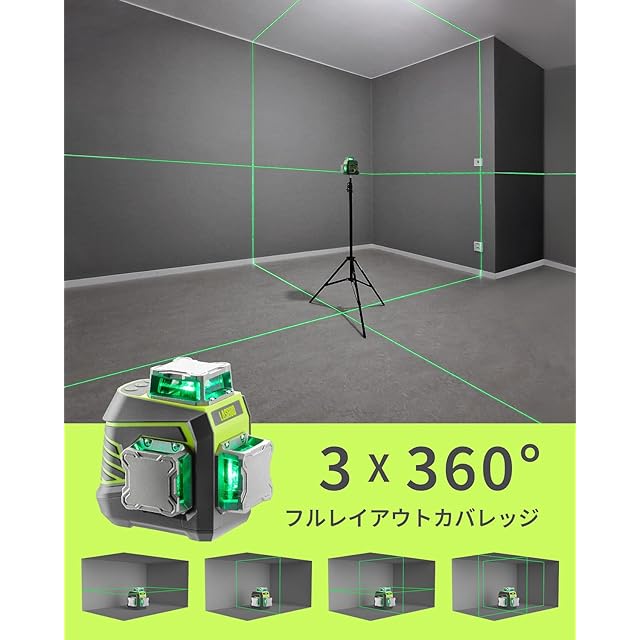 LasGoo LG-3Dx グリーンレーザー墨出し器 3x360°、3D 墨出しレーザーセルフレベリング、水平器 レーザー ビルドとアライメント用、充電式バッテリー、リモコン、磁気回転スタンド