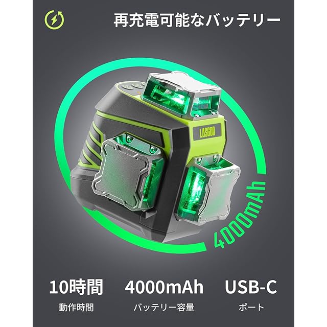 ユーザーフレンドリーなデザイン:グリーンレーザー墨出し器にはわかりやすいボタンコントロールパネルが装備されており、操作が簡単で便利です。 遠隔操作が可能なリモコンが付属しており、作業効率が大幅に向上します。 10時間の稼働時間を持つ大容量4000mAhバッテリーにより、タスクを完全に完了できます