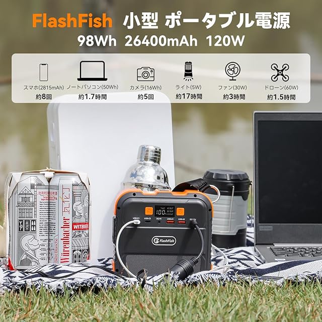 FlashFish ポータブル電源 26400mAh/98Wh 小型 軽量 家庭用蓄電池 AC(120W 瞬間最大240W) DC(120W) USB出力 急速充電 Type-C搭載 ポータブルバッテリー LEDライト付き モバイル電源 飛行機に持ち込みが可能 ソーラー充電 キャンプ 車中泊 地震 台風 防災グッズや停電にも安心