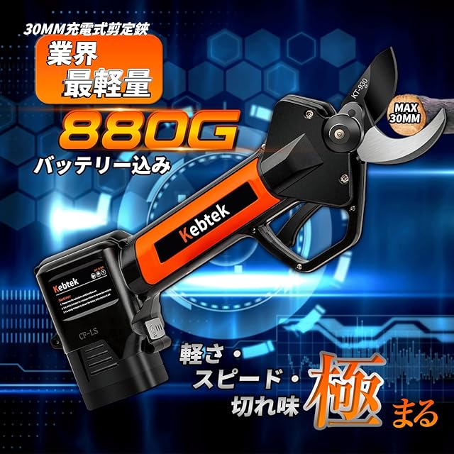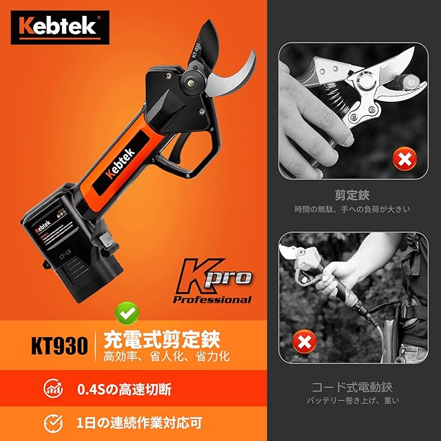 【軽量880g・日本製フッ素刃】Kebtek 電動剪定バサミ 16.8V コードレス 充電式剪定ばさみ 2500mAhリチウム電池2個付き 電動枝切り鋏 【0.4秒高速切断】プロ 剪定鋏 園芸 造園 果樹園 剪定工具 日本語取扱説明書付き 切断径30mm 品番KT930