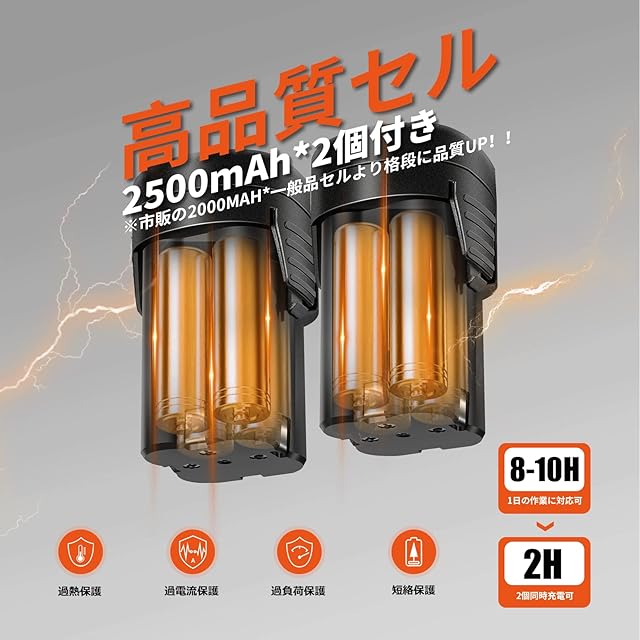 【1日の作業に対応可】:Kebtekの電気剪定鋏は大容量2500mAhのリチウム電池が2個付属しています。充電器はバッテリー2個を同時に充電できます。フル充電後、8〜10時間作動できます。1日の作業に十分対応できます。付属のキャリーケースに収納したり、別売りのウェストバッグに入れたりすると、外出作業も楽になります。