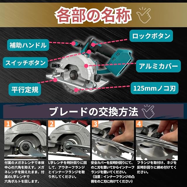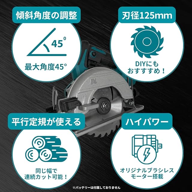 マキタ互換品 丸ノコ 充電式 丸鋸 丸のこ マルノコ まるのこ 電動工具 ブラシレス のこぎり 電気のこぎり 電ノコ 電鋸 チップソー 電動工具 長続航 木材 合板 コードレス 電動 18V 14.4V バッテリー 刃 刃外径 125mm 対応 バッテリー 充電器 別売 Longsafe (MAR12501-BL)