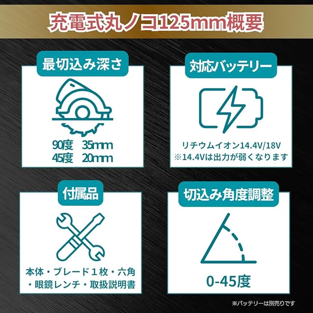 ✅【充実の基本性能】チップソー傾斜調整範囲:0°-45°、ノコ刃寸法:外径125mm・内径20mm。安心の替刃1枚付き。高品質な高炭素鋼製チップソーで木材から合板まで幅広い切断に対応。