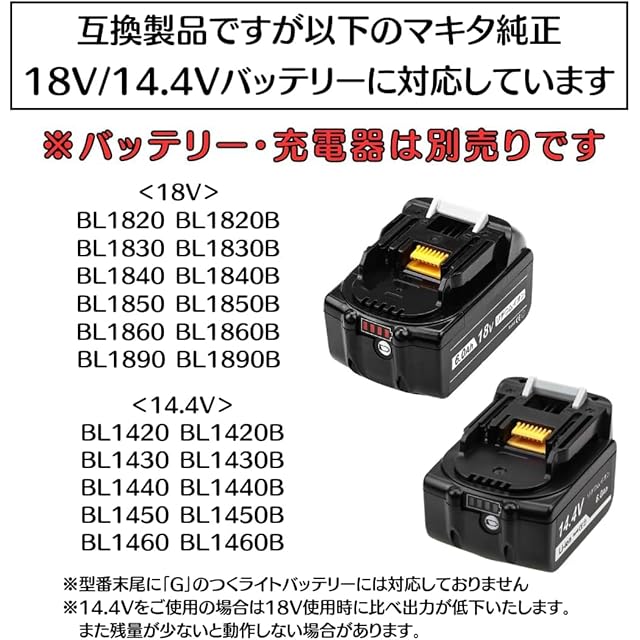 ✅【マキタ互換バッテリー対応】マキタ18V/14.4Vバッテリーに対応(BL1820/BL1830B/BL1860/BL1860B/BL1890/BL1890B)。※バッテリー・充電器は別売。※14.4Vはパワーが若干低下します。