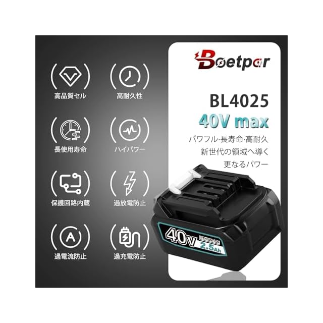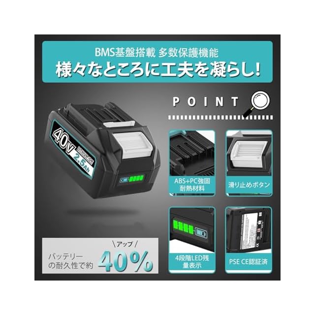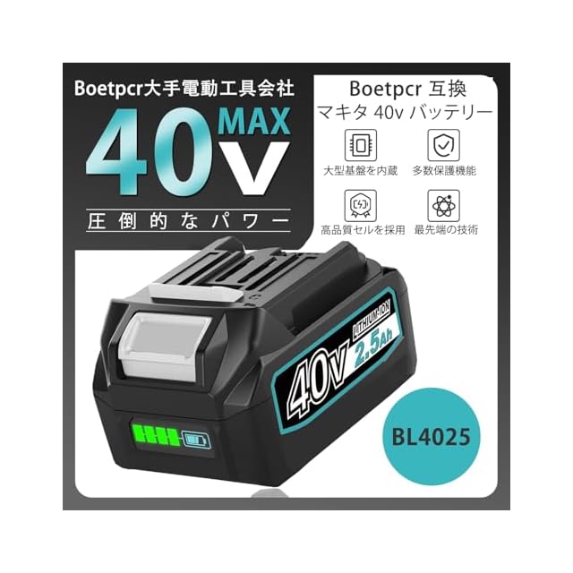 【商品仕樣】マキタ 40v バッテリー 互換 型番:BL4025 電圧: 40V 容量:2.5Ah (2500mAh) タイプ:リチウムイオン電池 CE PSE認証取得済み LEDランプ残量表示 多数保護機能搭載 安定性に定評のある高品質なセルを採用して、純正品と同じよう電動工具にて使用できます。