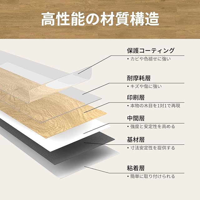優れた耐久性: 耐久性、耐摩耗性に優れたPVC材料のフロアタイルです。さまざまな傷や摩耗から表面を守り、美しい色柄を長期に渡って保護します。テーブルやいすなどを移動する時にも、傷つきにくく、土足でも対応できます。