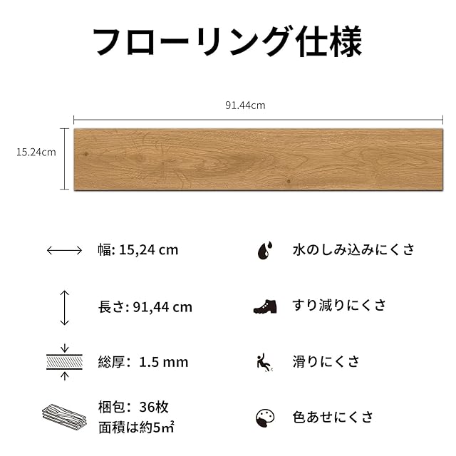 施工面積&梱包:サイズ:1枚の寸法 91.4cm×15.2cm 厚手:1.5mm 36枚/ボックス 5平方メートル 3畳 梱包の重量は15kgぐらいです。
