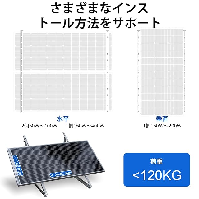 [適応性の向上] - 新しくアップグレードされたエコブラケットは、100Wから400Wの範囲のソーラーパネルアレイまたは約45インチの幅のパネルに対応できます。このブラケットは、すべてのECO-WORTHYソーラーパネルに適しています