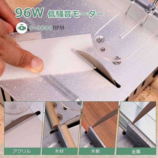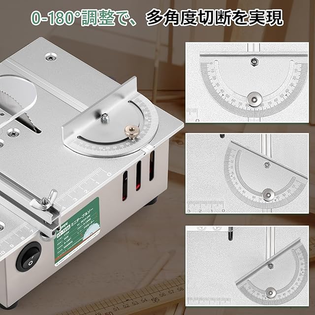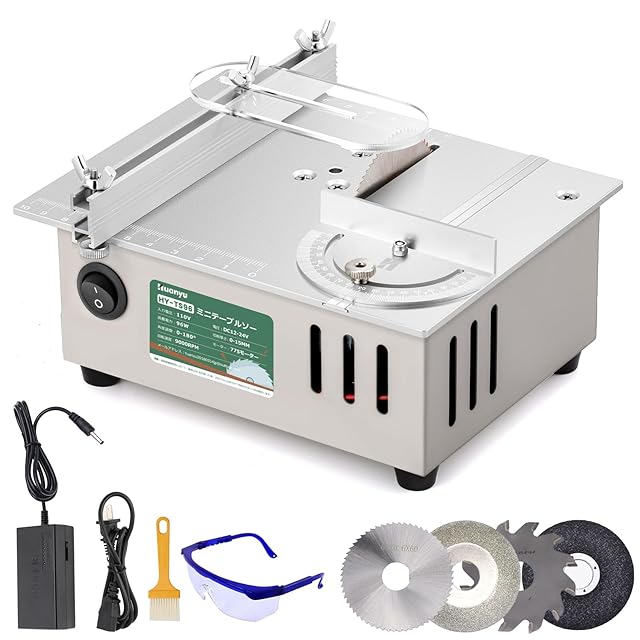 Huanyu ミニテーブルソー 7段変速 卓上テーブルソー 鋸刃4枚付き 9000RPM 0-15MM鋸刃昇降 0-180°角度調節切断 木材/基板/アクリル/金属用 小型DIY 木工用 日本語説明書付き