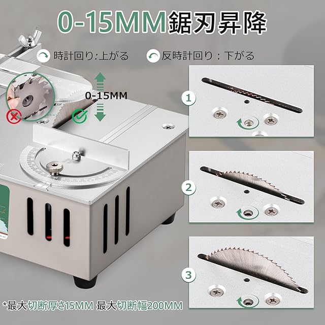【0-15MM厚さ調整】鋸刃は0-15MM昇降可能で、時計回りには上がり、反時計回りには下がります。最大切削厚さ15MM、最大切断幅200MMで、切り味もよいです。