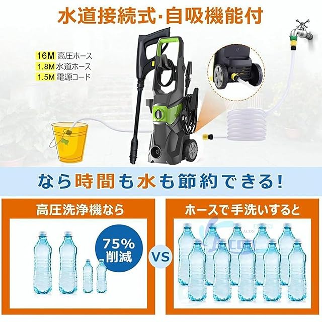 【 水道直結や自吸でも 】 高圧洗浄機は、水道直結はもちろん、自吸機能もありますので、バケツの水など、貯め水の吸い上げが可能なので水道の場所を問いません!バケツの水、お風呂の残り湯なども活用できるし、環境にやさしいし、水の節約にも優れる家庭用高圧クリーナーです。※自吸モードを利用する時、空気をできるだけ吸わないことのをご注意ください。