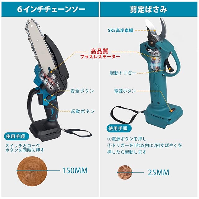 【高効率切断】6インチ 電動チェーンソーは700 Wの出力を持ち、6m/sまで高速回転し、急速に切断することができます。はさみ刃はSK5高炭素鋼を用いて鍛造されて、直径25mm以内の枝にも楽々剪定可能です。はさみで切断すると同時に、枝の切断面が平坦になり、病原体が入りにくくなり、植物の健康を維持します。木材の切断、竹の切断、薪作り、庭木の枝の剪定など作業に最適しています。