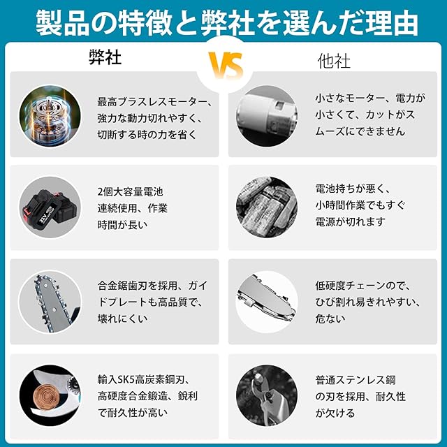 【最強ブラシレスモーター】Sipakeたかえだ 電動チェーンソーとたかえだ 剪定ばさみはパワフルなブラシレスモーターを搭載しています。他の製品より性能がもっと安定して、寿命が300%増加し、出力電力が75%増加し、エネルギー消費量が50%削減されて、切断効率が高くなります。作動時に火花が発生せず、モーターが摩耗しません、従来のブラシモーターの3〜5倍の耐用年数を持っています。長年ご愛用して頂けます。