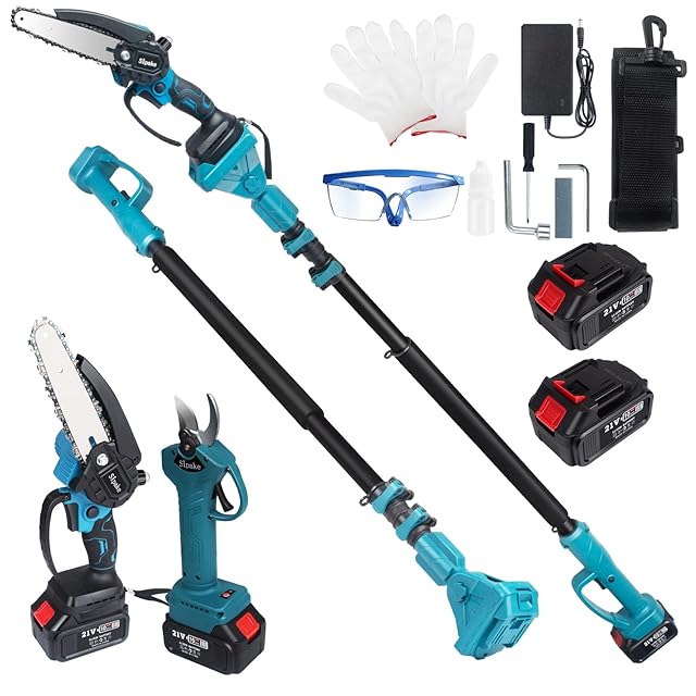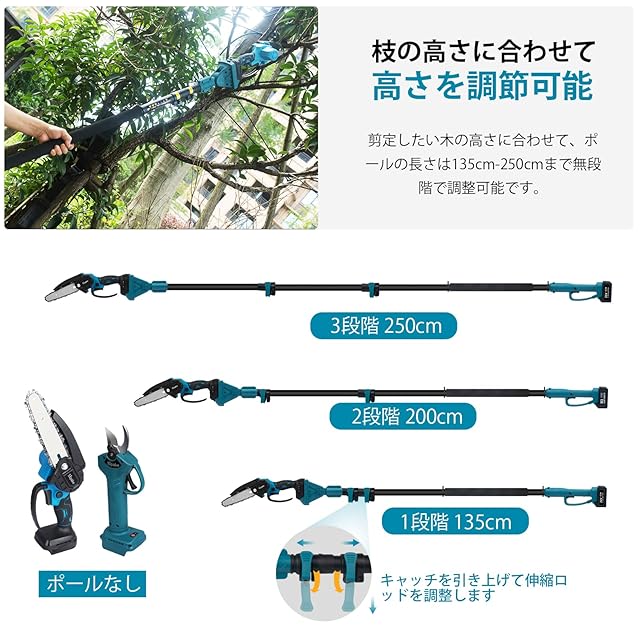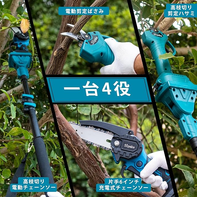 【一台4役・3-in-1 の高性能高枝切り電動チェーンソー】 ①Sipake 高枝切り電動チェーンソー と高枝切りバサミの3-in-1組み合わせセット、2.5メートルの伸縮延長ポールが付属して、ポールの長さは1.35メートルから2.5メートルまで無段階で調整可能で、高所の木の枝を簡単に切れます。②延長ポールを外すと、小型チェーンソーと電動剪定ばさみ単品として低い木を切断できます。作業環境とニーズに合わせて使用できます。非常に便利な組み合わせ高枝切りセットです!