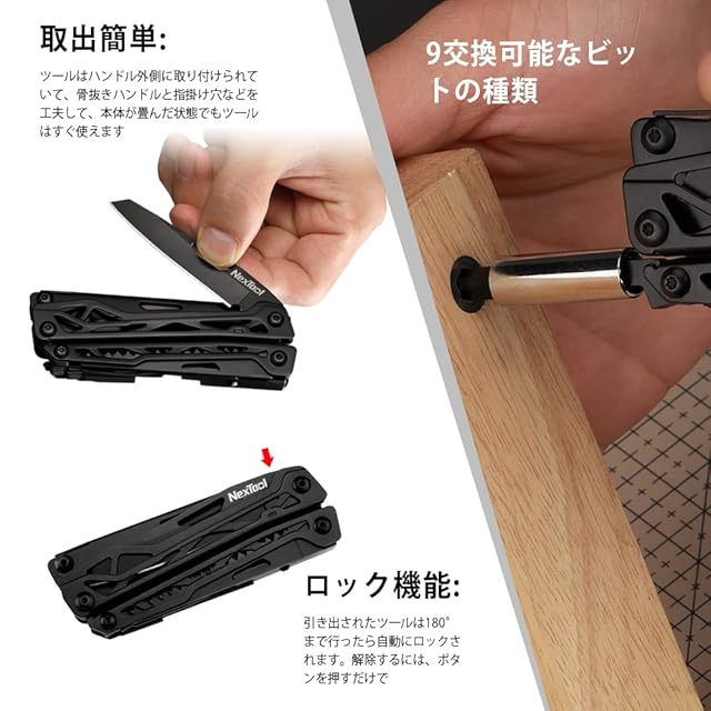 多機能ツール: マルチツール,ラジオペンチ、標準ペンチ、ワイヤーループペンチ、のこぎり、プラスドライバー、ナイフ、マイナスドライバー、栓抜き、ナイフ、ハサミ、ビットホルダーと 9ドライバービットセット(H3六角ビット、H4六角ビット、H5六角ビット、3mmマイナスドライバー、5mmマイナスドライバー、7mmマイナスドライバー、PH1プラスドライバー、PH2プラスドライバー、PH3プラスドライバー)