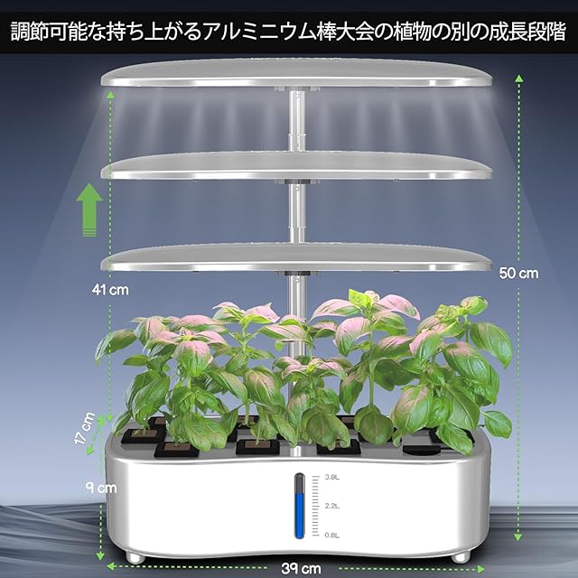 高さ調整可能で室内栽培に最適:植物の成長に合わせて高さを調整可能なLEDライトを搭載。均一な光を確保し、室内での水耕栽培をサポート。取り外し可能なライトポールでメンテナンスも簡単。大葉やハーブの栽培にも最適です