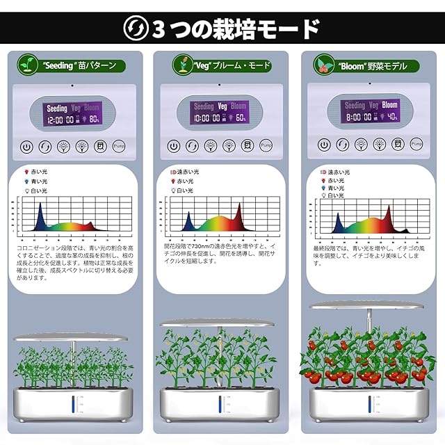 3つの成長モードで多様な植物に対応:水耕栽培キットは、実生モード(青強化)、野菜モード(紫外線強化)、ブルームモード(赤強化)の3モードを搭載。大葉やハーブ、野菜、花、果物など、家庭菜園に最適なLEDライトで、植物の成長段階に応じた最適な光を提供。