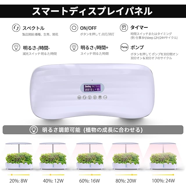 水耕栽培キット、LED植物成長ライトとスマートディスプレイを搭載し、簡単に操作できます。自動水循環システムとタイマー機能により、3つの栽培モードが提供され、12種類の植物を栽培できます。栽培キットの高さと照明明るさは、植物の成長段階に応じて調整可能。これにより、植物に最適な生育環境を提供します (ホワイト)