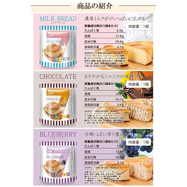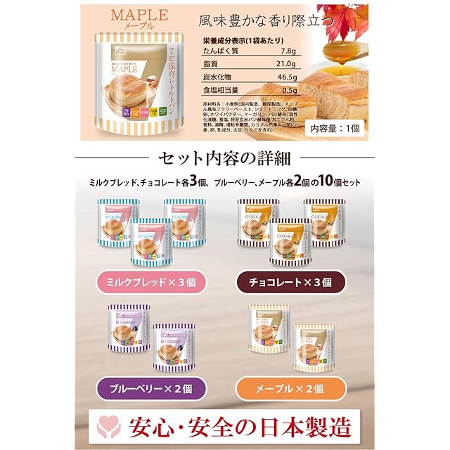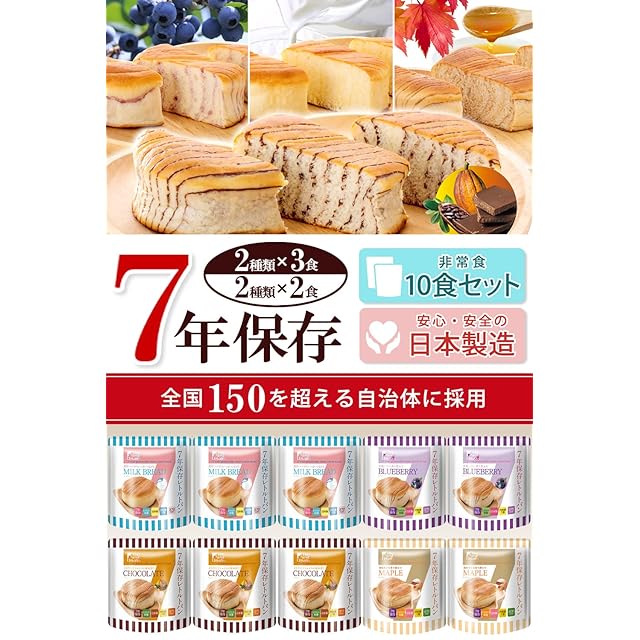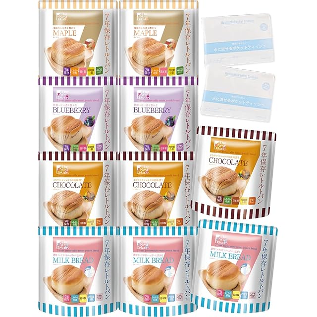 【調理不要でそのまま食べられる】 水もお湯も不要で、開封後にそのまますぐに食べられる保存食です。パンは4種類の味が合計10個分と、非常用の食品としては十分な量があります。