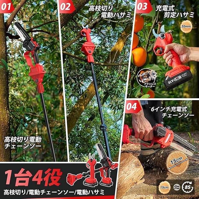 【セット内容&品質保証】M6G Proのセット内容:6インチ電動チェーンソー×1、予備チェーン×1、電動剪定バサミ×1、伸縮延長ポール×1、大容量バッテリー×2、充電器×1、ガイドバー用保護カバー×1、ショルダーストラップ×1、安全保護メガネ×1、作業用手袋×1、オイルタンク×1、日本語取扱説明書×1。商品に万が一不具合がございましたら、当店までご連絡ください。24時間以内に丁寧かつ迅速に対応いたします。初期不良と判断された場合には、無償での交換対応を承っております。また、ご使用中にご不明な点がございましたら、「販売元」ページより「質問する」ボタンをクリックして、お気軽にお問い合わせください。