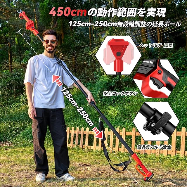 【高枝切り・チェーンソー・剪定ハサミの1台4役】SEESIIのM6G Proは、高枝対応の電動チェーンソーと電動剪定ハサミを簡単に切り替え可能な多機能モデルです。ポールを取り外せば、手持ちの6インチ電動チェーンソーまたは電動ハサミとしても使用可能で、低所の枝も手軽にカットできます。作業環境や用途に応じた柔軟な使い分けが可能です。無段階調整可能な伸縮ポールは125cmから250cmまで長さ調節でき、最大約450cmの作業範囲を誇り、高所の作業も安全かつ効率的に行えます。ヘッド部分は0~180°で角度調整でき、剪定作業の自由度もさらにアップ。果樹、竹、木材、庭木など、さまざまな植物の剪定・伐採に最適な一本です。