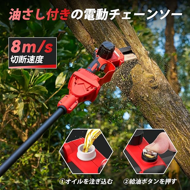 【コードレス&大容量バッテリー2個付属】SEESIIのM6G Proは、電源コード不要のコードレスタイプで、屋内外を問わず自由に使用可能。作業中にコードを誤って切断してしまう心配もなく、安全性も向上しています。高性能2.0Ahリチウムイオンバッテリーを2個付属しており、1個あたり最大約30分の連続稼働が可能。予備バッテリーがあることで、長時間の作業にも安心して対応できます。高枝チェーンソーご使用時のご注意:❶必ず電源を入れてから、高枝チェーンソーを対象の枝に当ててください。❷使用前には、必ずバッテリーを十分に充電してください。❸作業中は本体を強く押し付けないでください。(チェーンソーおよび高枝ポールの自重だけで十分な圧力です。過剰な力を加えると、動作が停止する可能性があります。)