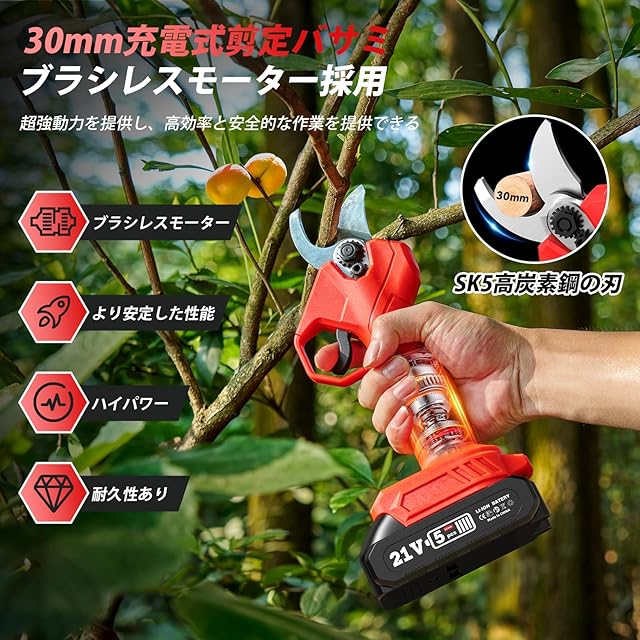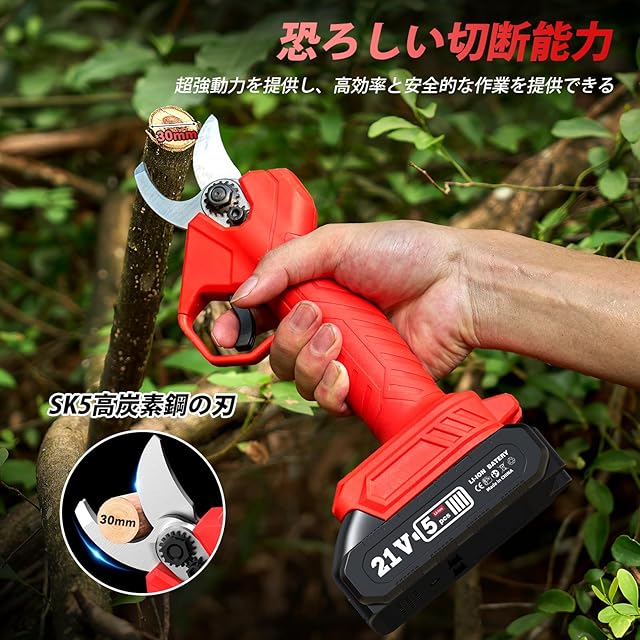 【高出力で簡単に切断できる充電式電動剪定ばさみ】本製品の剪定ばさみは、最大開口幅30mmで、高品質モーターを搭載し、パワフルな切断能力を実現。30mm以内の枝木をスムーズに、枝を傷めずにカットできます。軽量設計で扱いやすく、手の負担が少ないため、関節炎など手の力に不安がある方でも快適にご使用いただけます。起動時は標準で30mmの剪定径となっており、電源ボタンを押すことで20mmにサイズを切り替えることも可能です。(※ご注意:トリガーと電源ボタンは同時に押さないでください。)