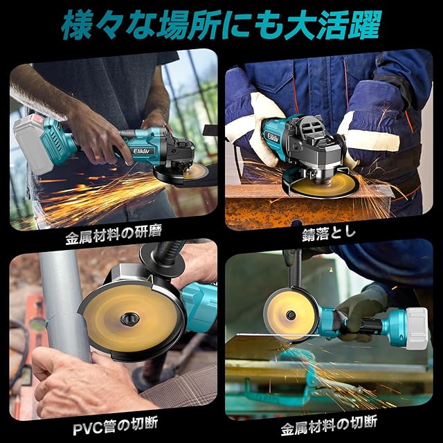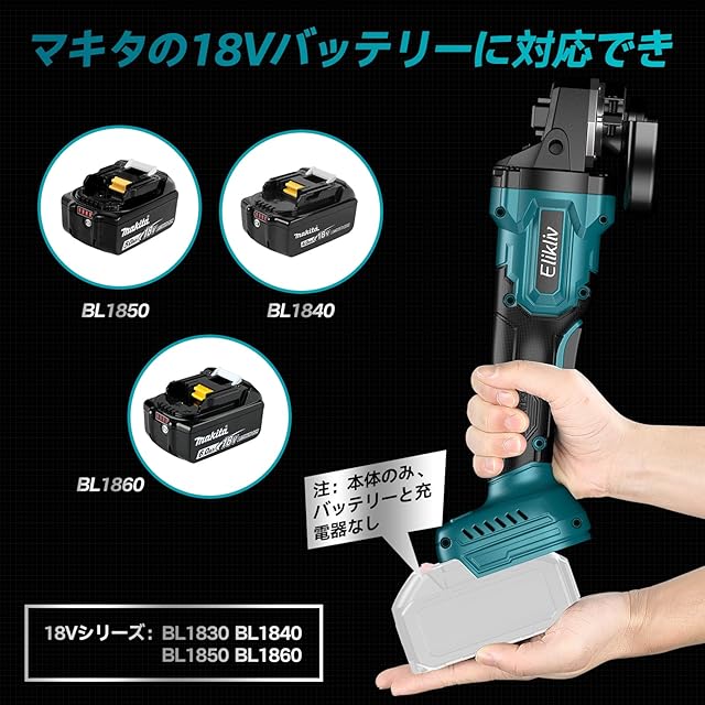 【マキタ 18V シリーズ】このディスクグラインダー G100 は、Elikliv のバッテリーとマキタ 18V リチウムイオンバッテリー(BL1820b、BL1830b、BL1840b、BL1850b、BL1860b など)に対応しています。