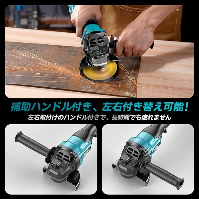 【コードレス・ブラシレスモーター搭載】この充電式グラインダーはブラシレスモーターを搭載しているため、作動時に火花が発生せず、モーターの摩耗も抑えられます。これにより、モーターの寿命と効率が大幅に向上し、ハイパワーモーターによってパワフルな作業が可能です。