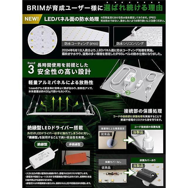 【安全性の高い設計】長時間使用を前提とした安全性の高い設計を採用しています。放熱に優れた薄型アルミ板に加え、接続部の保護処理を行うことで耐久性が向上。また、外付けLEDドライバーでは手に触れてしまうのに対し「隔離型」を採用することで電気ショックリスクの低減や過電流からの確実な防御を実現しました。