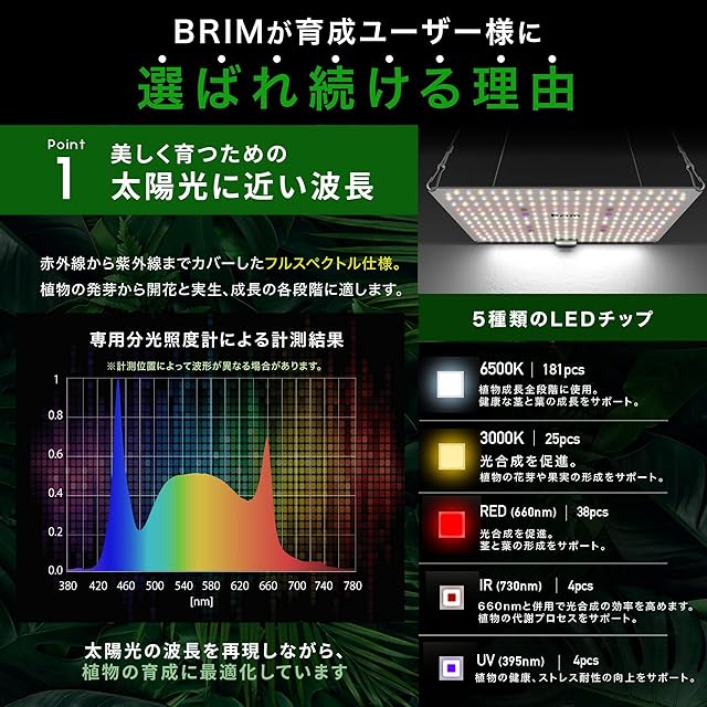 【太陽光に近い波長&高演色】美しく育てるために必要な太陽光を再現したフルスペクトル仕様を採用。IR/UVを搭載した5種類のLEDチップで、演色性評価数(CRI)ではRa90-94の高演色を実現。太陽の下のような植物本来の鮮やかな色が広がります。