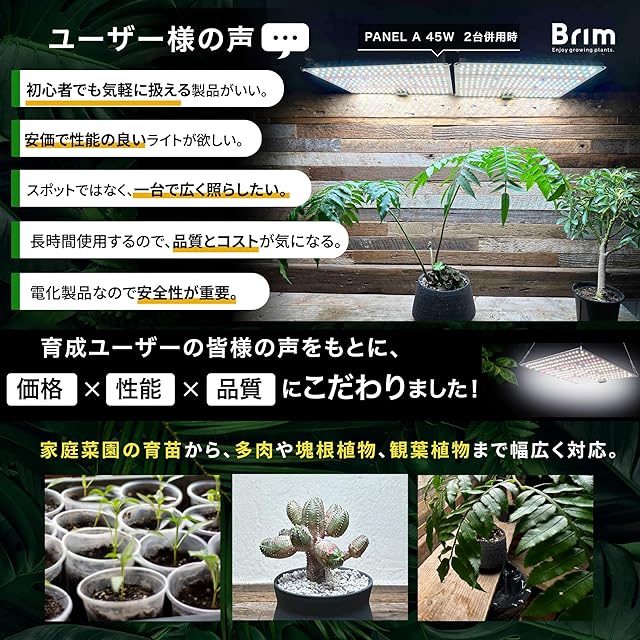 【ベーシックモデルの植物育成パネル】植物をもっと手軽に美しく育てる国内ブランドBRIMより、ベーシックモデルの育成パネル「PANEL A」が誕生しました。「性能」×「品質」×「お手頃」にこだわり、安定的なパフォーマンスで初心者の方にも扱いやすい仕様になっております。