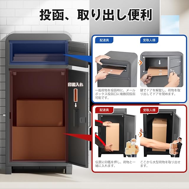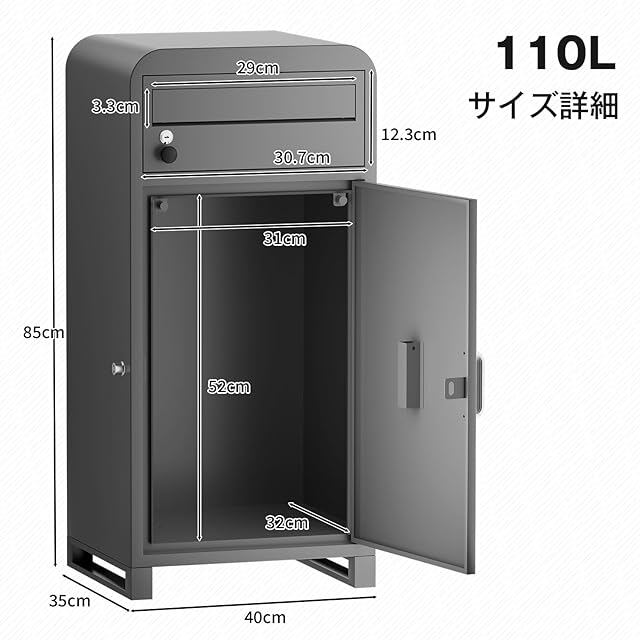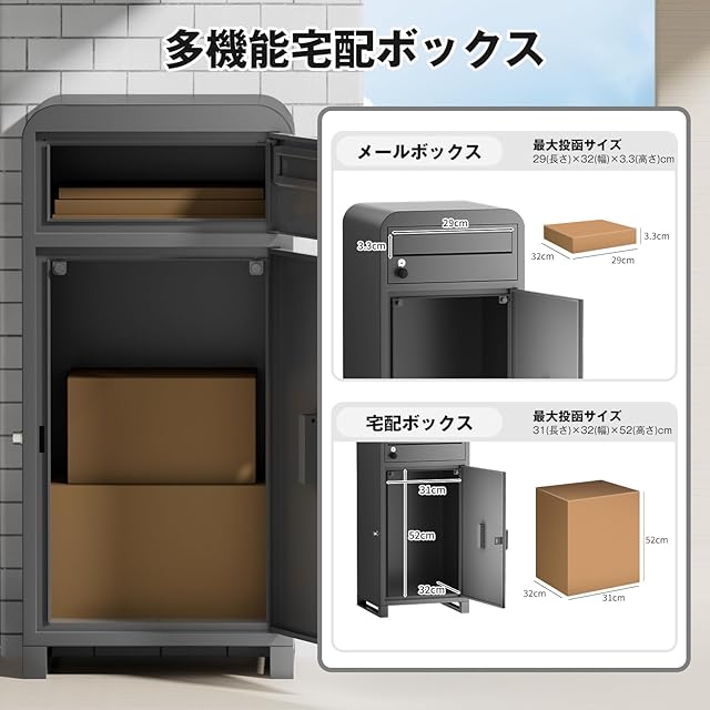 【商品規格・サイズ】 商品サイズ:40*35*85cm メールボックス投函口サイズ:29*3.3cm メールボックス取り出し口サイズ:30.7*12.3cm 宅配ボックス投函/取り出し口サイズ:52*31cm 万が一不良品が届いたり、ご使用中に何か不明点や質問等がございましたら、お気軽にお問い合わせくださいませ。誠心誠意にご対応させていただきます。