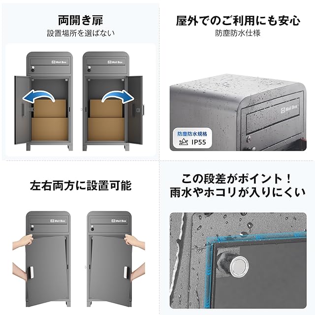 【高品質・防水防錆】箱全体に亜鉛メッキを施し、丈夫で防錆性に優れております。IP55の防水構造を採用することで、雨水の侵入や腐食を防ぎます。それに、宅配BOX内部に水排出穴があり、不用意に入った液体を排出でき、大切な荷物をしっかりと保護します。屋外でもより長くご利用頂けます。