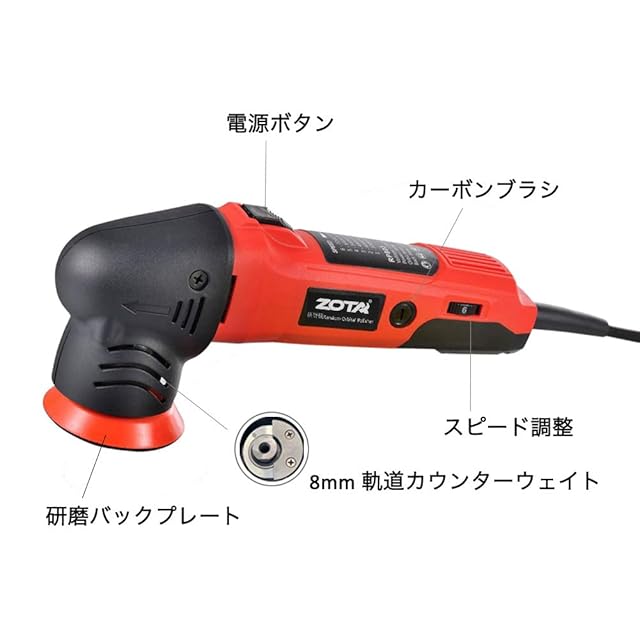 ZOTAポリッシャー,75mm小型 ランダムオービタル式,100V六段変速 3000-7200RPM 恒定回転速度 業務用 家庭用 自動車用 車磨き バイク用, 木工 錆消し 傷消し キズ消し 艶出し ワックスがけ 床磨き 家具のキズ修復 様々な 表面部分のコーティング 操作簡単