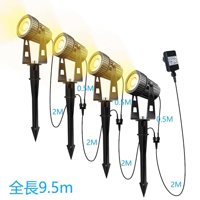 「製品仕様」高品質のガーデンライト,LM: 950LM-1100LM,ランプとランプ間の線長: 2M+0.5M, 電源と最初のランプ間の線長:2M,電力: 12W. 回転角度:270度。3w COBチップを使用すると、通常のLEDチップよりも明るく安定しています。花壇に魅惑的な輝きを加え、明るい屋外の夜を提供します。オスとメスのコネクターが改良され、交換が容易に。