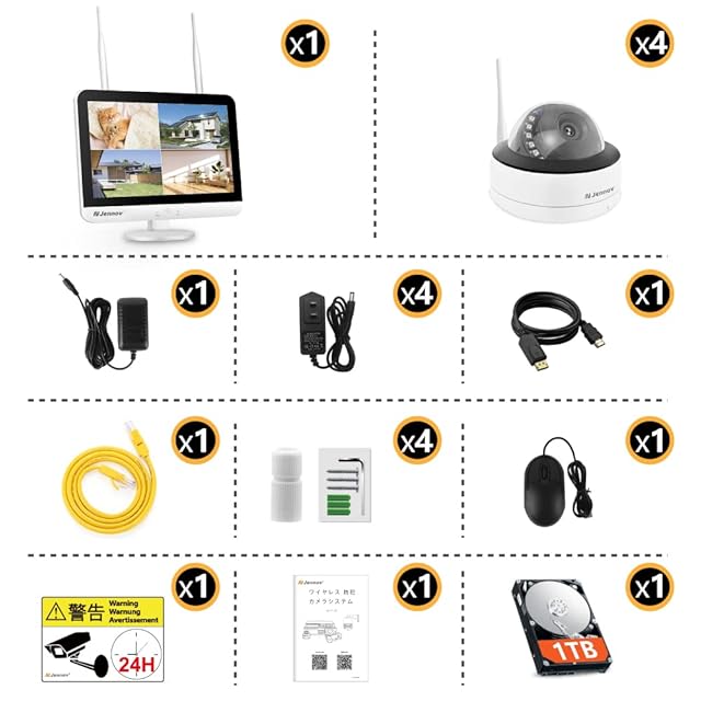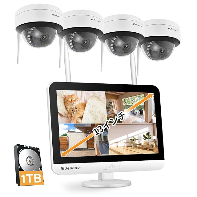 Jennov 防犯カメラ 屋外 モニター付き 室内 500万画素 監視カメラ 屋外 4台セット ドーム型防犯カメラ wifi マイク付き 音声録画 1TBHDD内蔵 録画機能付き IP67防水 10chまで追加可能 スマホ連動 遠隔監視 動体検知 警報通知 暗視機能 Eseecloud対応