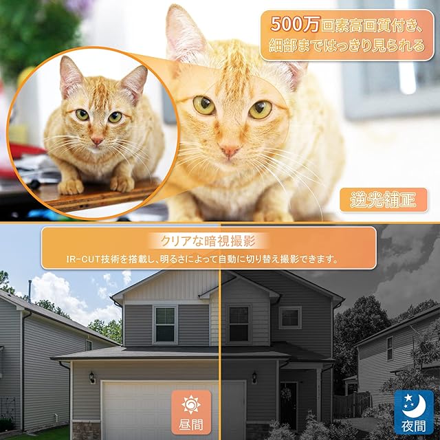 ♬【圧倒的なHD500万画素●スマート暗視機能】大手メーカーの高画質のネットワークカメラでよく採用されているsony製の高品質のCMOSイメージセンサーを搭載し、2560X 1920の高い解像度で撮影できるワイヤレス防犯カメラです。対象物をありのまま、最適化した鮮明度ときれいさを映せます。人の顔はもちろん、腕時計の指針の動き、または車のナンバーまでもはっきりと撮影ができ、情報確認するときに欠いてはいけないのです。また。昼はカラフルな視覚体験ができ、夜は15個の赤外ライトが点灯し、真っ黒な環境でもはっきりと映れます(夜の映像はモノクロです)。赤外線ライトは15m~20mの範囲まで到達、8m以内の人の顔や車のナンバーもわかりやすく分別できます。それに、高精細映像を映すためのHDMIコードが付属し、電源さえ確保すれば、モニターと接続するだけで映像の鑑賞ができ、複雑な設定は一切不要。レジ周りなど重要な箇所を高画質で撮影するのに最適で、店舗や工場の品質管理など様々な場面で活躍します。