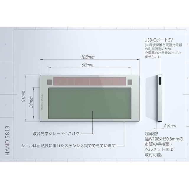 超薄型の4.8mm厚! 幅W108xH50.8mmの市販の手持面・ヘルメット面に取付可能。