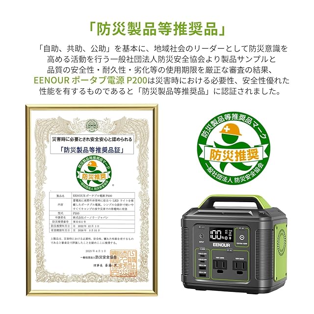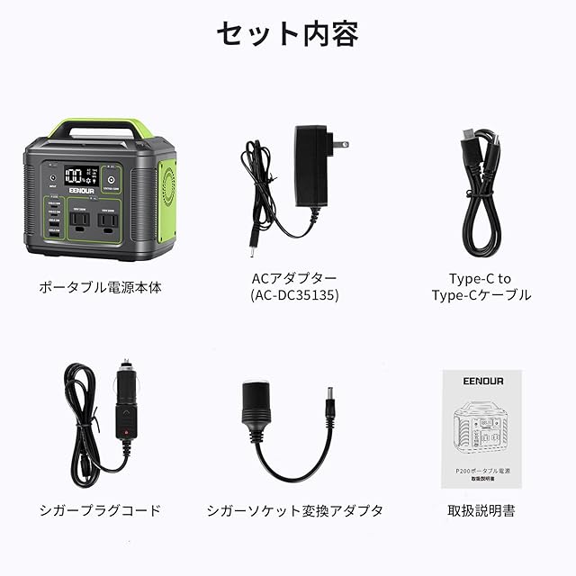 EENOUR ポータブル電源 P200 54000mAh/200Wh 小型 コンパクト ポータブルバッテリー Type-C入出力(PD対応 60W) AC(200W 瞬間最大400W)/DC(120W)/USB出力 PSE認証済 50Hz/60Hz デュアル充電対応 四つの充電方法 パネル型LEDライト付 車中泊 ソロキャンプ 旅行 ビジネス 防災グッズ 停電時に