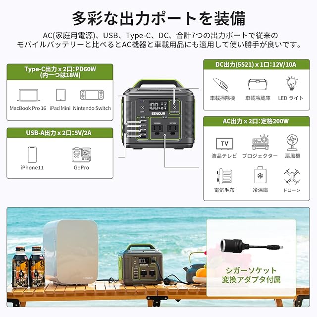 ✅【AC/USB/DC多彩な出力口】コンパクトなのに出力ポートの数や種類も豊富でAC(50Hz/60Hz対応、全国適用)、USB-A、Type-C、DCなど計7つ装備します。従来のモバイルバッテリーと比べてAC機器と車載用品にも適用して使用シーンは幅広くなります。Type-Cポートは最大60WのPD給電に対応して最新のiPhone14やMacBook Airシリーズをフルスピードで充電することが可能です。