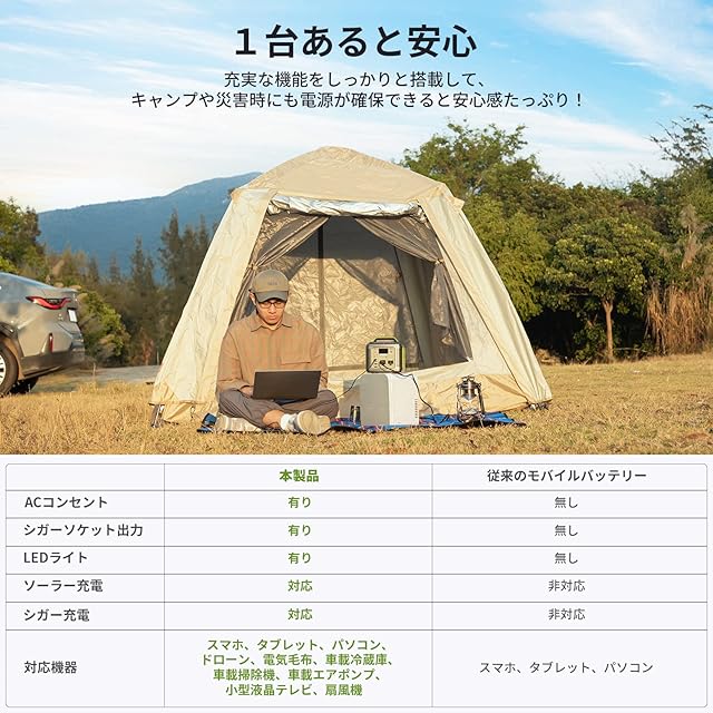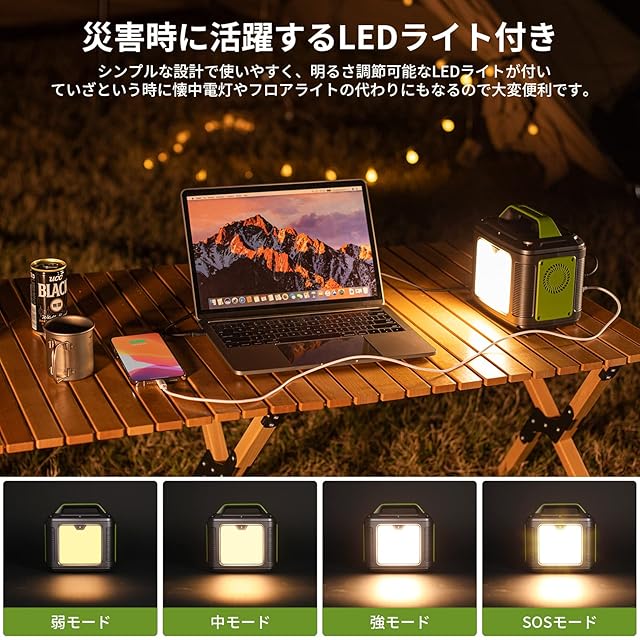 ✅【パネル型LEDライト付き】大容量電源としてはもちろん、LEDボタンを長押しすると常時点灯(弱-中-強)とSOSを切り替えLEDライトとしても使えます。モードは4段階調整できるので、使用シーンと合わせて使い分けが可能です。シンプルな設計で使いやすくてキャンプの夜や災害での停電時に大活躍します。